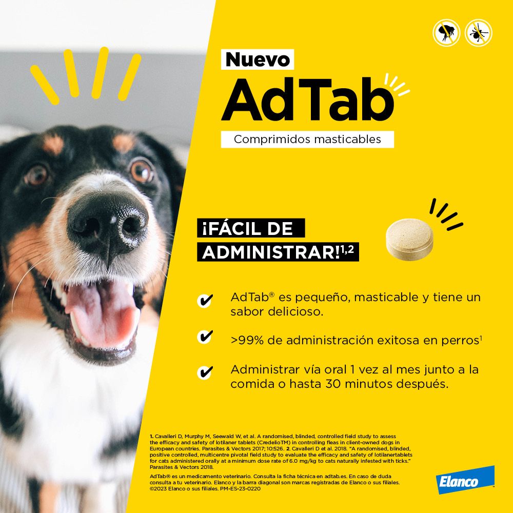 AdTab antiparasitario en comprimidos se administra vía oral 1 vez al mes junto a la comida o hasta 30 minutos después.