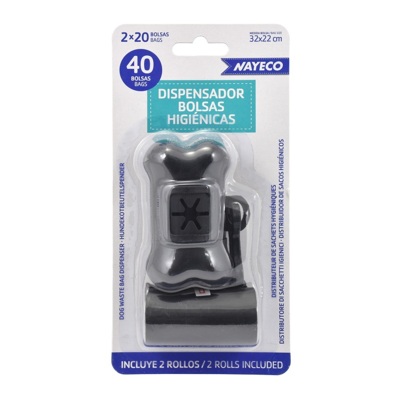 Portabolsas higiénicas en forma de hueso, disponible en cinco colores diferentes: negro, plateado, rosa, azul y rojo. Incluye dos rollos de bolsas de 32x22cm.