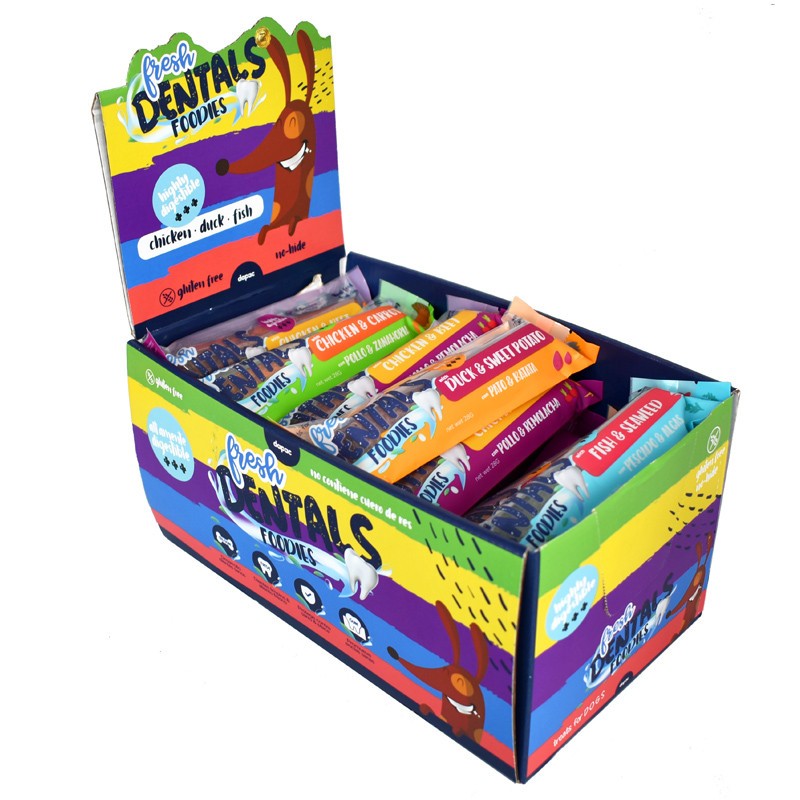 Los Dental Foodies de Fresh Dentals con una original forma de estrella, además de tener un sabor exquisito, ayudan a tu perro a mantener una buena salud bucodental. Su textura esponjosa permite un mayor contacto con la dentadura del perro de forma que tanto encías como dientes queden sanos y fortalecidos. La caja contiene 4 sabores: pato y batata, pollo y zanahoria, pescado y algas y pollo y zanahoria. Medidas: 13 cm largo.