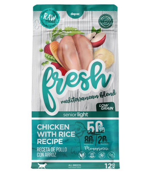 La variedad Senior Light de Fresh Mediterranean Blend está especialmente indicada para perros adultos (senior) de cualquier raza. La receta incluye verdadero pollo, ingredientes naturales y además tiene bajo contenido en grasas, por lo que es ideal para perros con tendencia al sobrepeso. Sus principales ingredientes son pollo deshidratado, pollo fresco 20%, arroz entero y guisantes.
