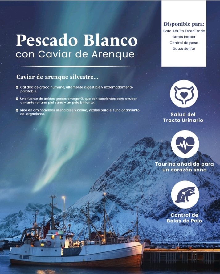 El Pescado Blanco es una fuente de proteína, vitaminas B6, B12 y niacina. También contiene ácidos grasos Omega 3 los cuales ayudan a mantener la piel, el pelaje y las articulaciones sanas.