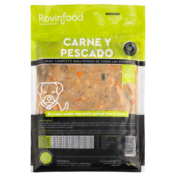 Nuestro menú de carne y pescado es una receta estrella para todos los públicos caninos, ya que está pensada y equilibrada tanto para cachorros como para perros adultos. Está compuesta de una doble fuente de proteína a base carne cerdo y pescado blanco y azul y la completamos con una combinación de verduras exquisita para obtener un poderoso menú sin gluten y sin cereales que gusta a todos.