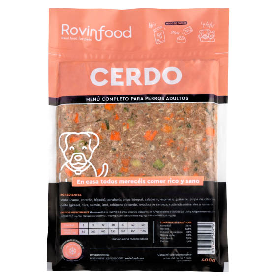 Cerdo 51% (carne, corazón, hígado), zanahoria 16,5% , arroz integral 14,5% , calabacín 14% , espinaca 2,5%, guisante 0,5%, pulpa de cítricos, aceite (girasol, oliva, salmón, lino), colágeno de cerdo, levadura de cerveza, sustancias minerales y romero.