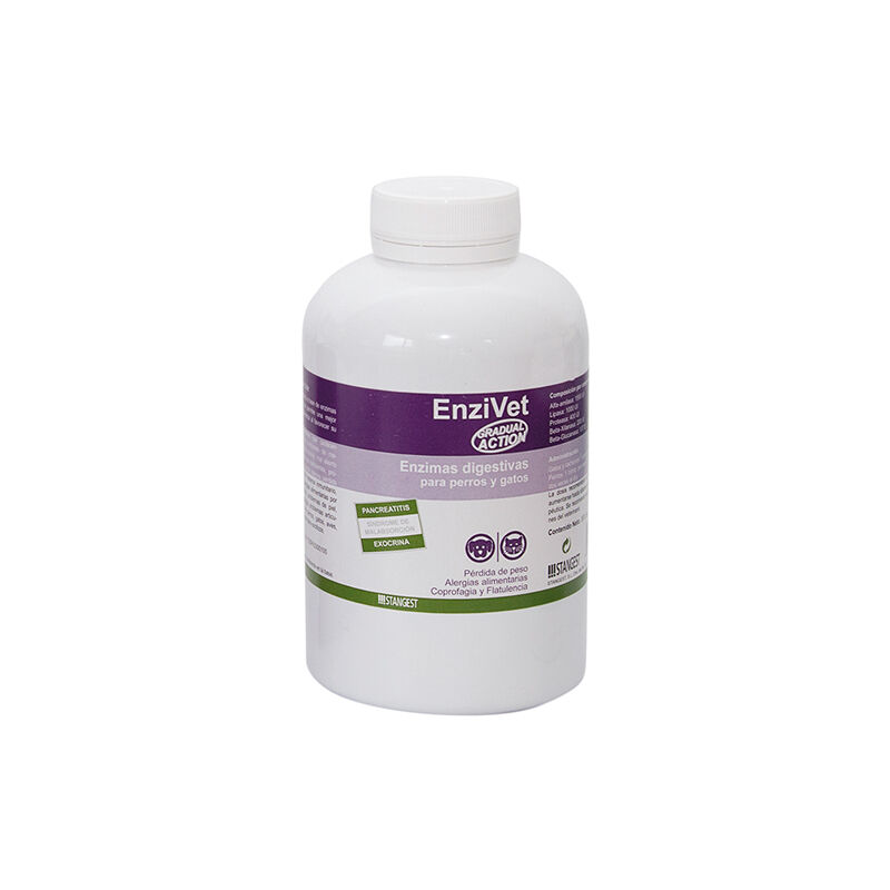 Indicado en: síndrome de malabsorción, pancreatitis exocrina, mal aliento provocado por digestiones deficientes, problemas digestivos, diarrea, pérdida de peso, trastornos del sistema inmunitario, letargia, flatulencias, problemas de piel, caída, de pelo excesiva, alergia, problemas articulares y coprofagia.