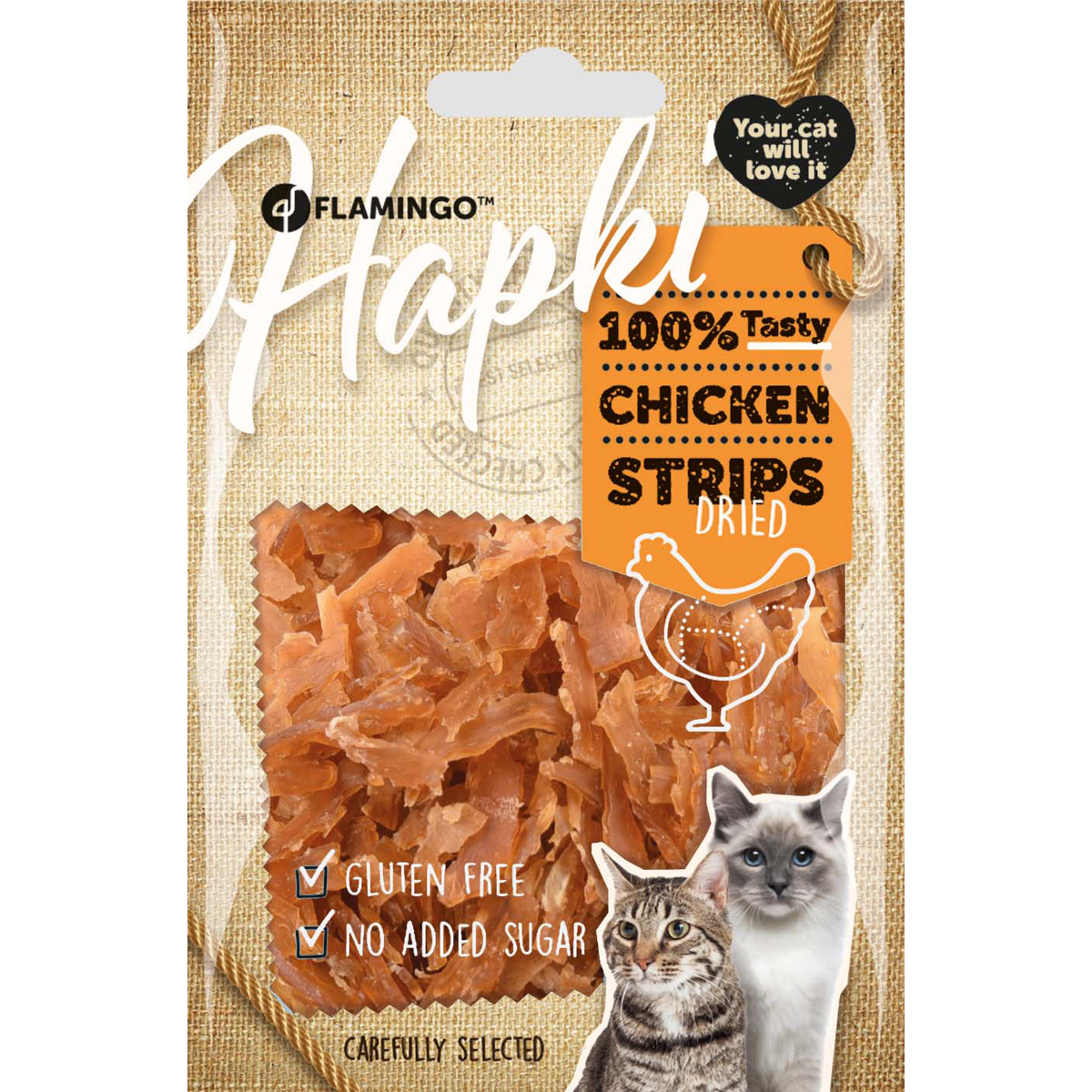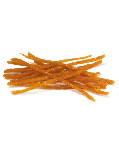 Snack en forma de tiras, a base de carne de pollo. 100% natural.